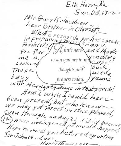 | In a phone conversation on September 16, 2000 he told me that one of his favorite memories of his service at Brorson Danish Lutheran was meeting with the young people of the Luther League on Sunday evenings. He also said that in the winter when the snow was deep, he could only drive to the intersection 1 1/2 miles east of the church. One of the members of the congregation would meet him there with the horse drawn sleigh to bring him the rest of the way to the church. | |