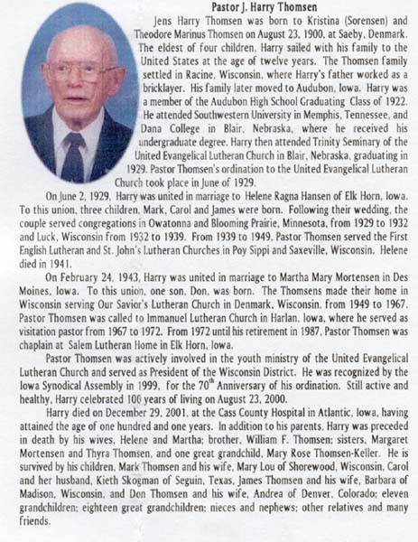 Born: August 23, 1900 in Vestre Mark, Sæby, Hjørring County, Denmark. Parents: Theodor Marinus Thomsen and Kristine Pedersen Sørensen Thomsen. Died: December 29, 2001 at Atlantic, Iowa. Buried at Elk Horn, Iowa on January 2, 2002. He died due to a brain hemorrhage suffered in a fall a few days earlier. He was bright, active, and engaged in life to the very end. Married: Ragna Helene Hansen in 1929. She died in 1941. He married Martha Mortensen in 1943. She died on April 16, 1999. Ordained: June 1929 at Elk Horn, Iowa. Came to America in 1912. |